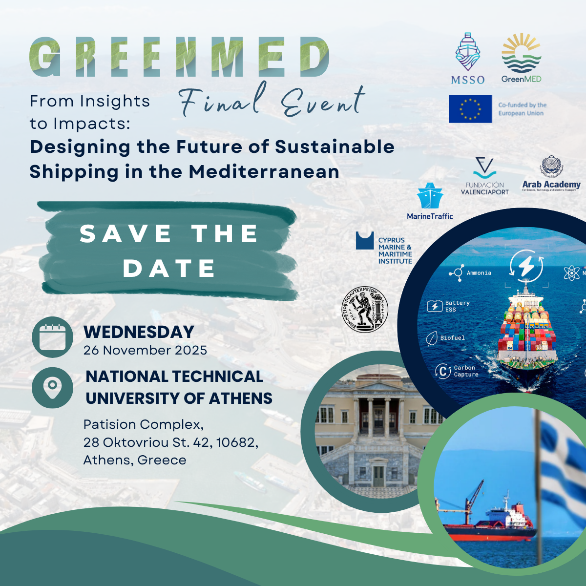 NATIONAL TECHNICAL UNIVERSITY OF ATHENS Patision Complex, 28 Oktovriou St. 42, Athens, GreeceFrom Insights to Impacts: Designing the Future of Sustainable Shipping in the Mediterranean The GreenMED project will host its Final Event on Wednesday, November 26th, 2025, in Athens, Greece. This milestone event will present the full results of the project and the official launch of the Mediterranean Sustainable Shipping Observatory (MSSO). High-level speakers and stakeholder dialogue […]