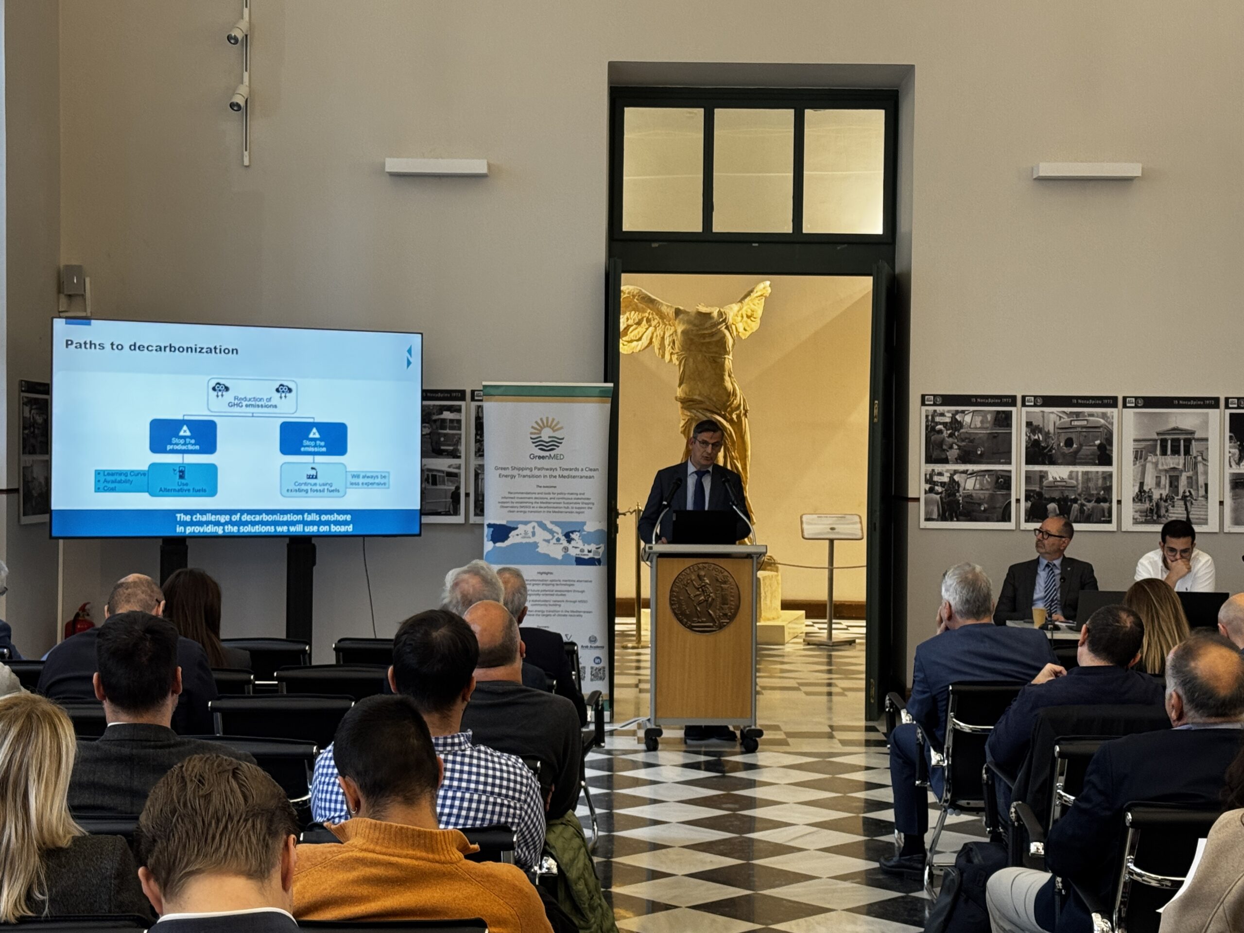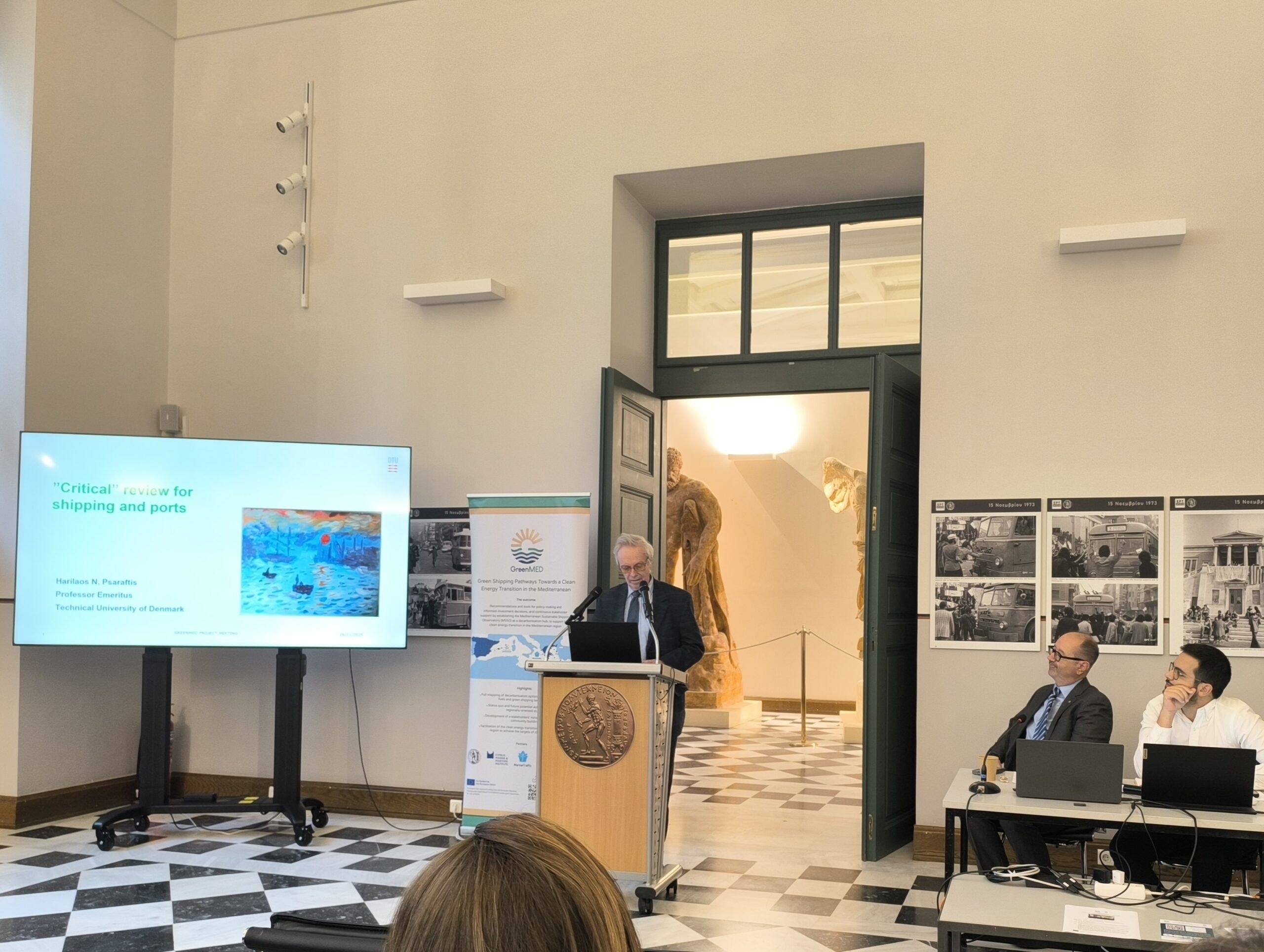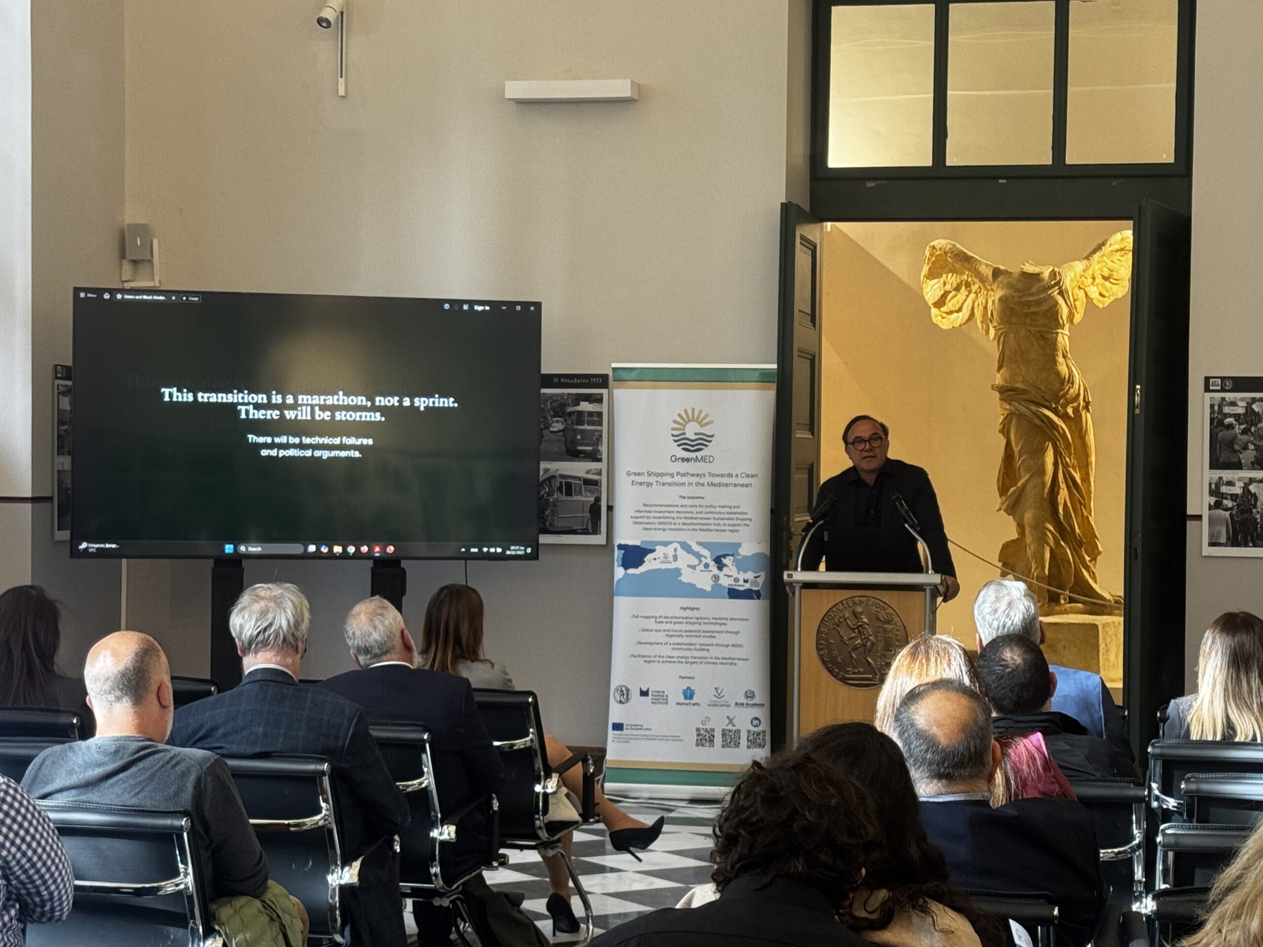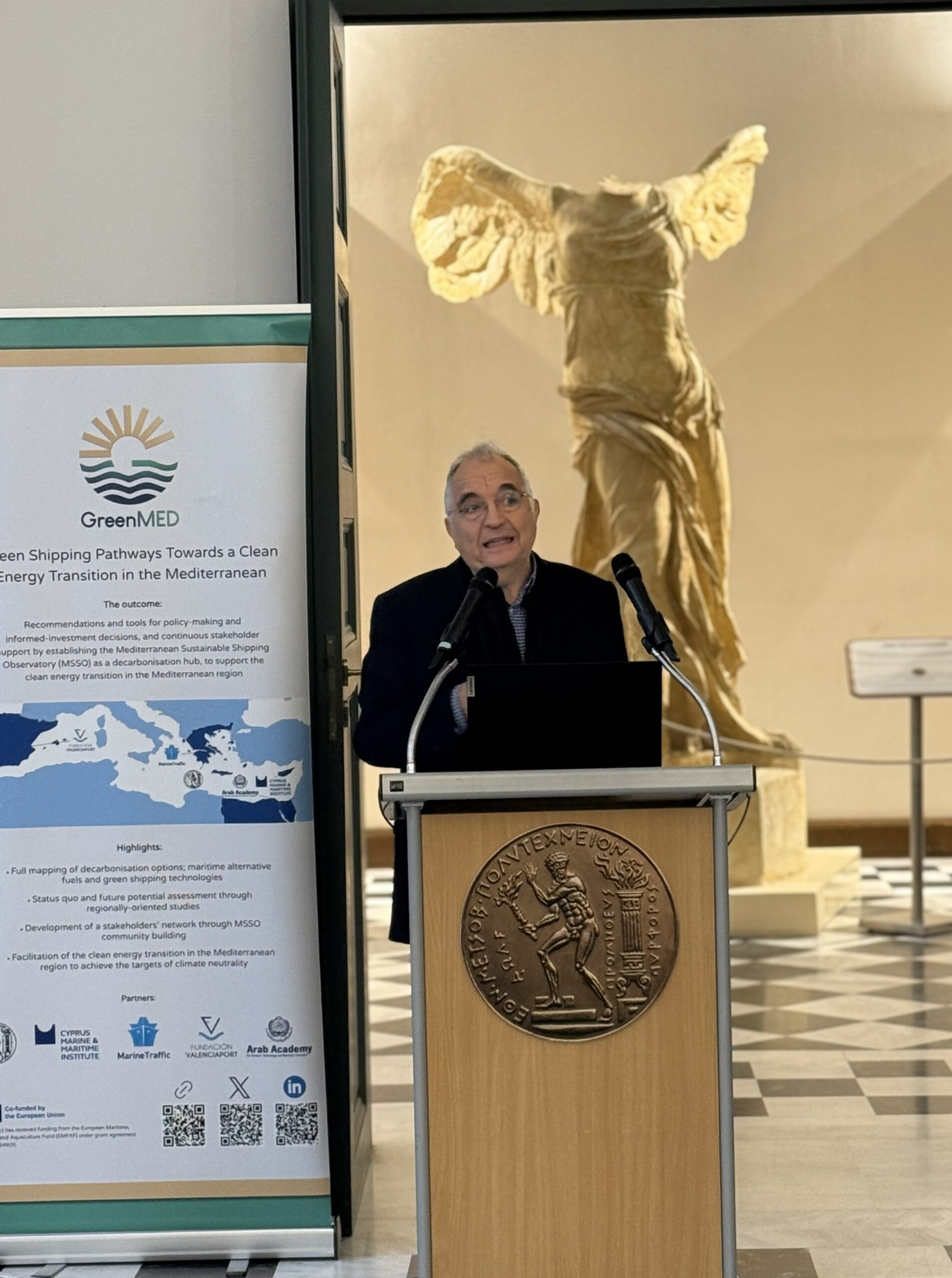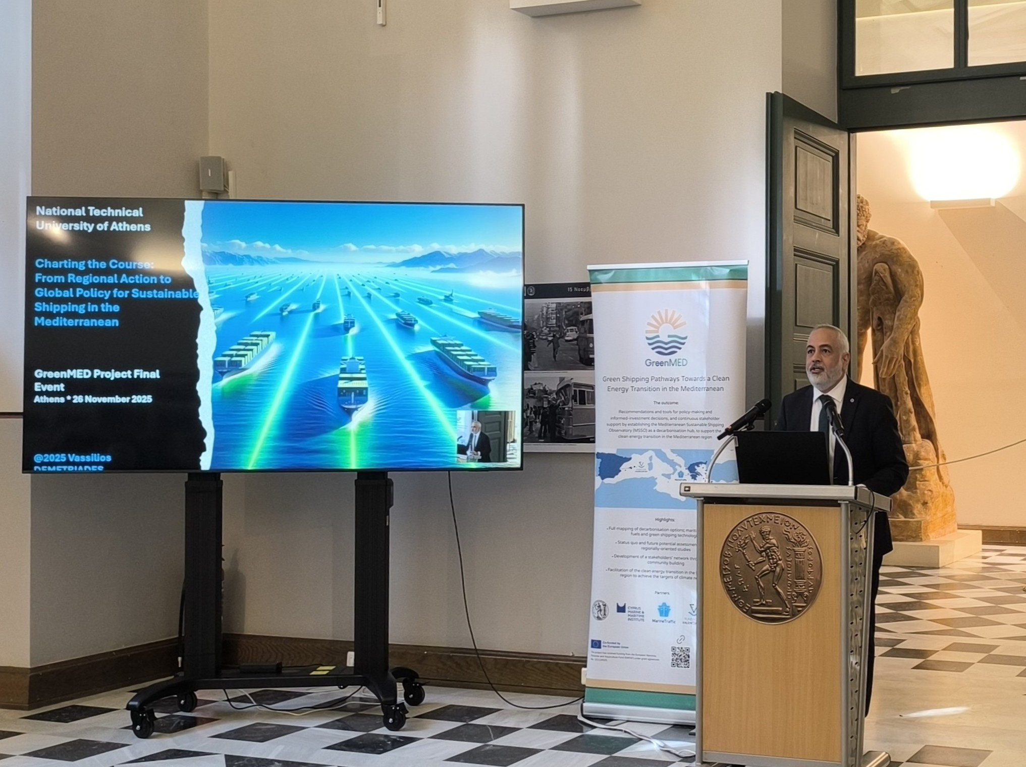 The GreenMED Final Event, held in Athens on 26 November 2025, in the historic premises of National Technical University of Athens, marked the culmination of a comprehensive 2-year effort to deliver green shipping pathways for the Mediterranean. In his opening address, Prof. Nikolaos P. Ventikos introduced the project’s vision and outcomes, outlining the integrated methodological framework developed by GreenMED. He highlighted the scientific basis behind the project’s studies, fuel and energy demand analyses, supply chain and port-focused mappings, including foresights and cost–benefit modelling. Central to this introduction was the Mediterranean Sustainable Shipping Observatory (MSSO)—a decarbonisation hub for the Eastern and wider Mediterranean region—and its platform and tools, designed to support decision-making by enabling stakeholders to explore decarbonisation options and identify industry gaps, under evolving market and policy conditions.