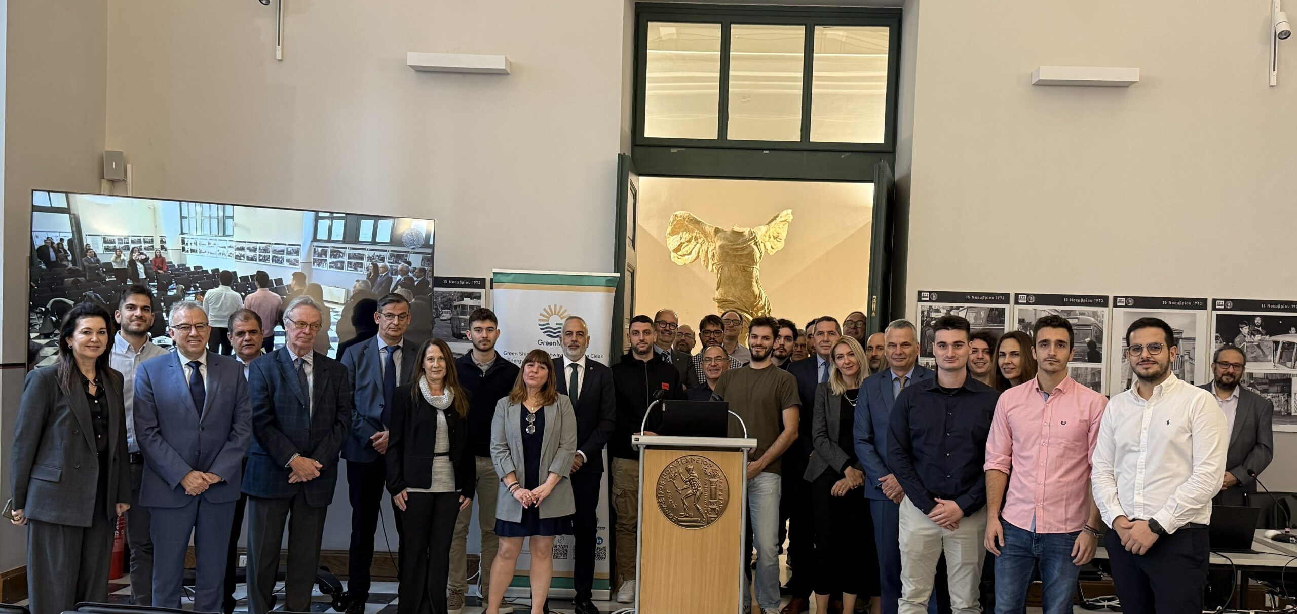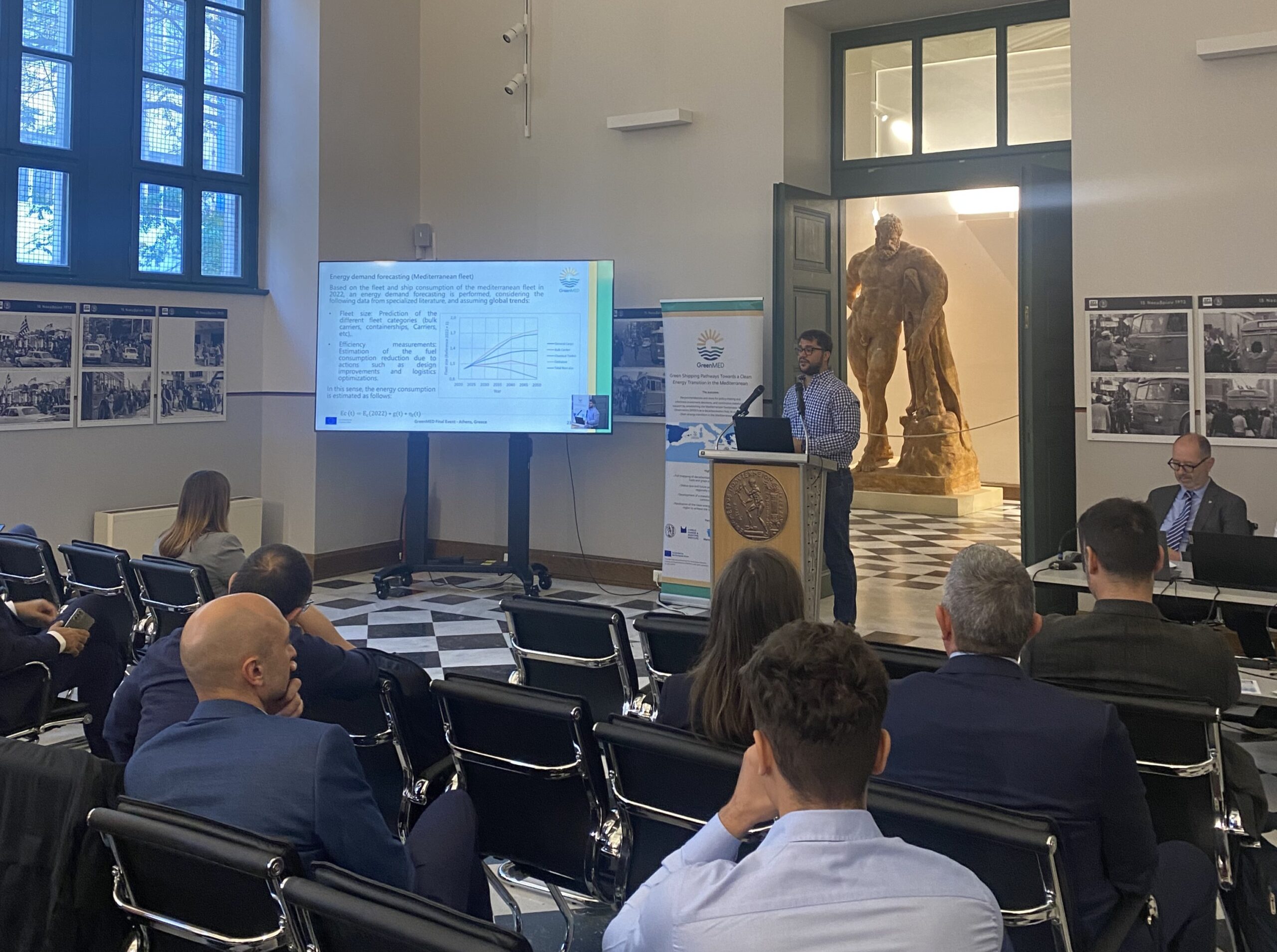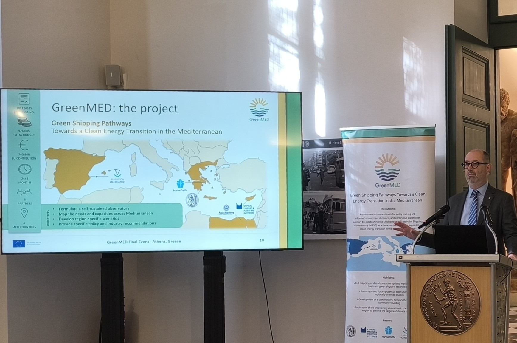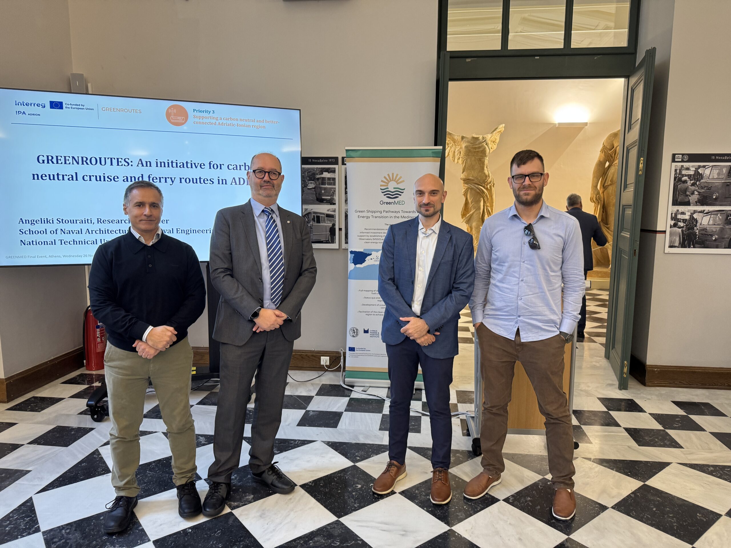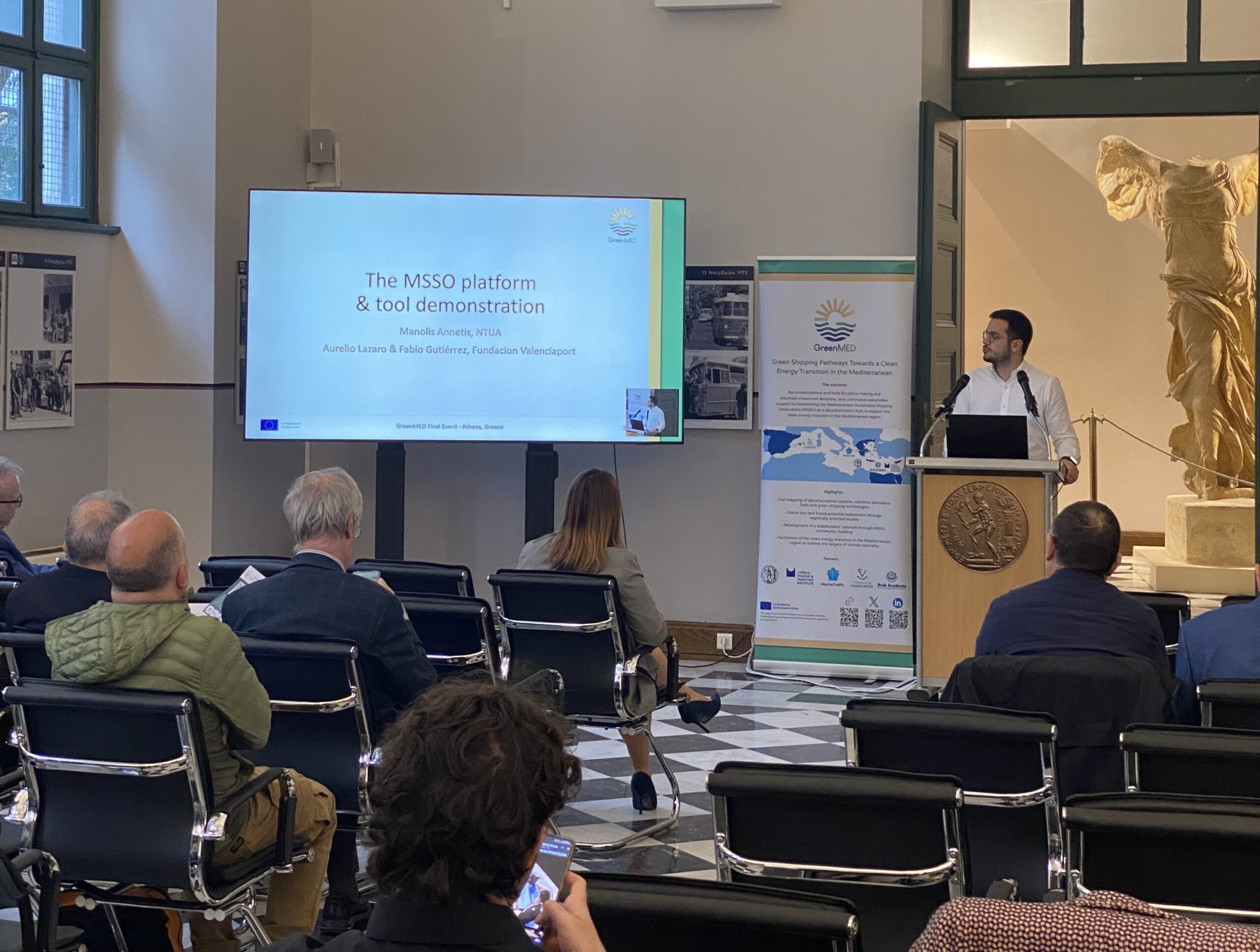 The GreenMED Final Event, held in Athens on 26 November 2025, in the historic premises of National Technical University of Athens, marked the culmination of a comprehensive 2-year effort to deliver green shipping pathways for the Mediterranean. In his opening address, Prof. Nikolaos P. Ventikos introduced the project’s vision and outcomes, outlining the integrated methodological framework developed by GreenMED. He highlighted the scientific basis behind the project’s studies, fuel and energy demand analyses, supply chain and port-focused mappings, including foresights and cost–benefit modelling. Central to this introduction was the Mediterranean Sustainable Shipping Observatory (MSSO)—a decarbonisation hub for the Eastern and wider Mediterranean region—and its platform and tools, designed to support decision-making by enabling stakeholders to explore decarbonisation options and identify industry gaps, under evolving market and policy conditions.