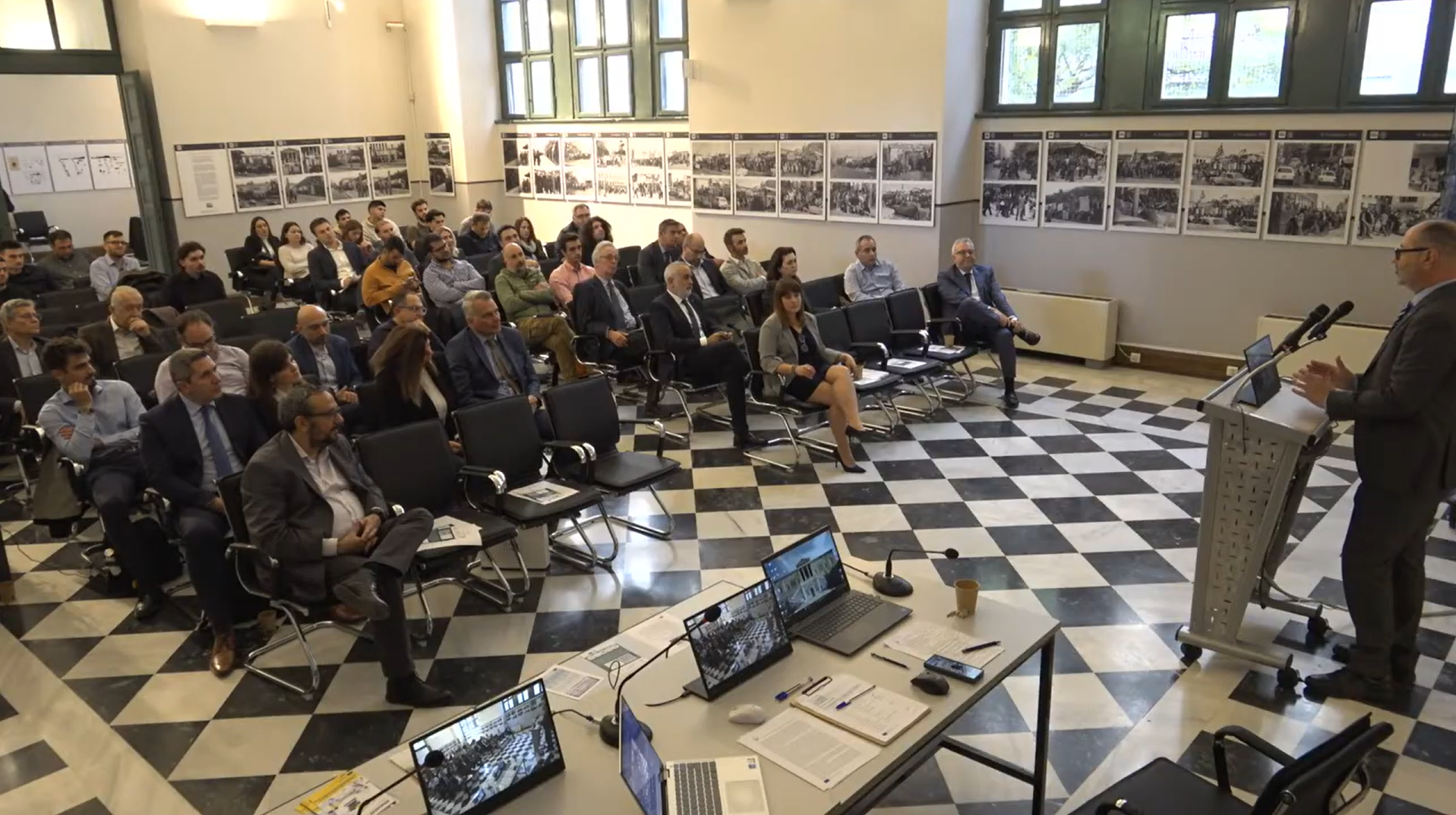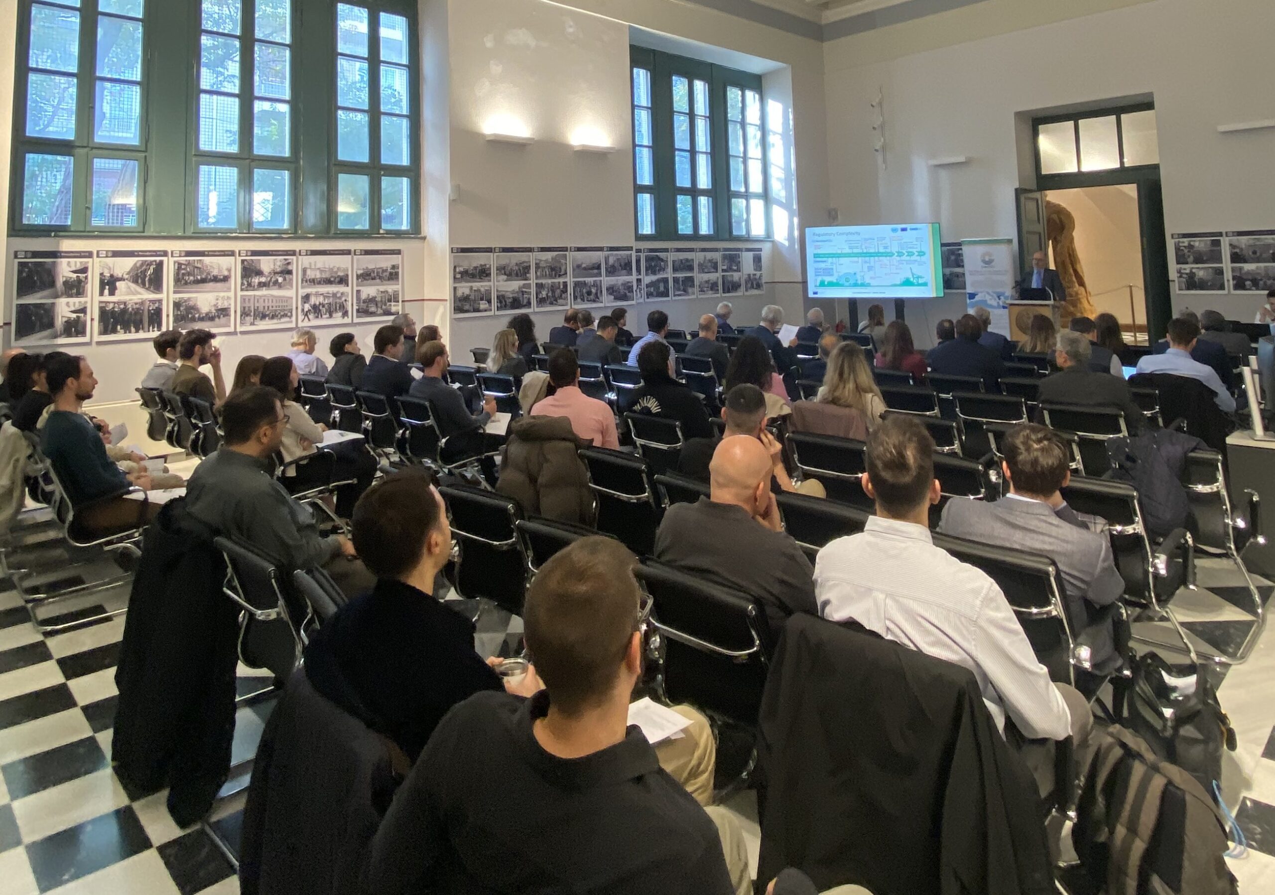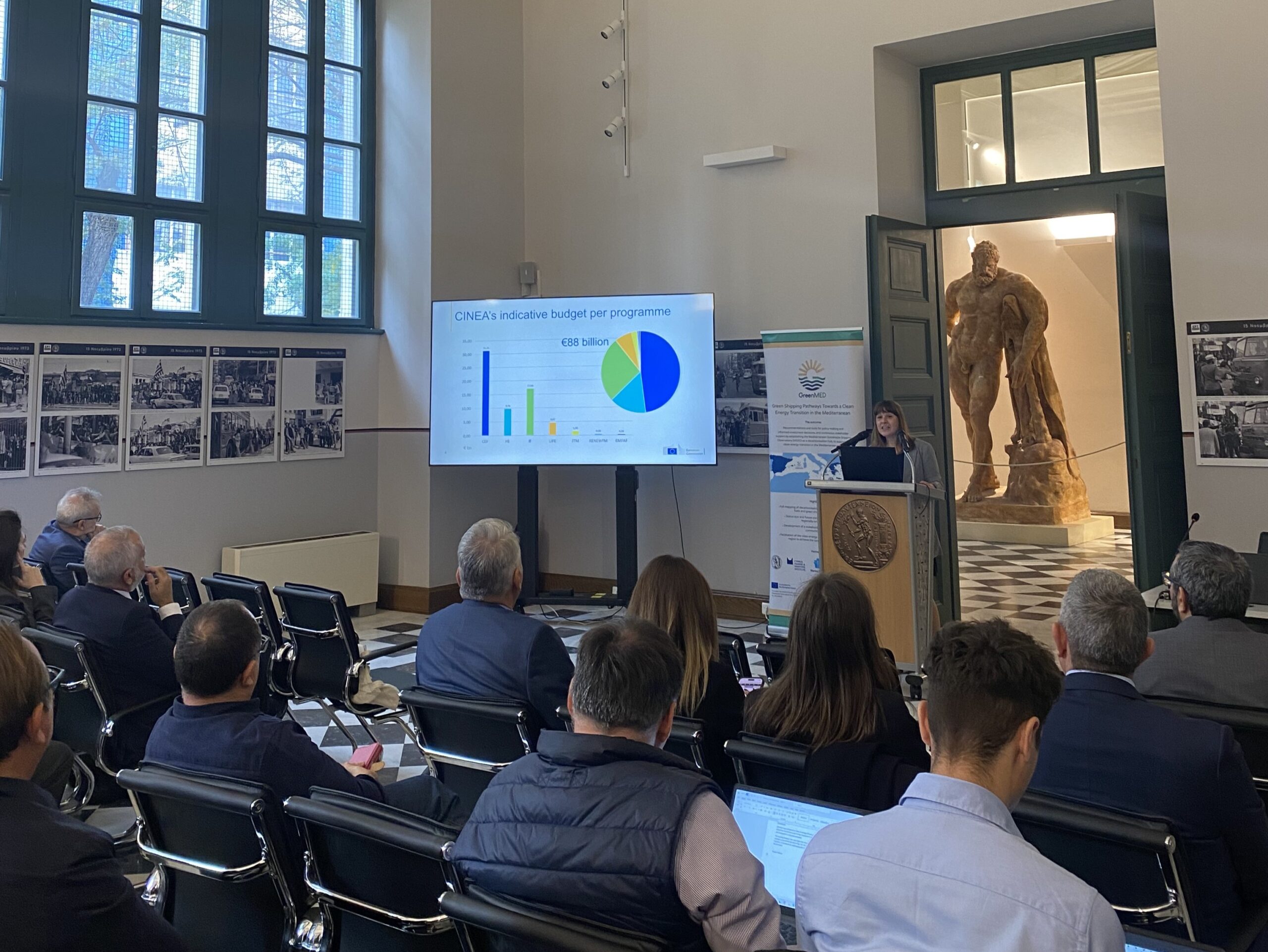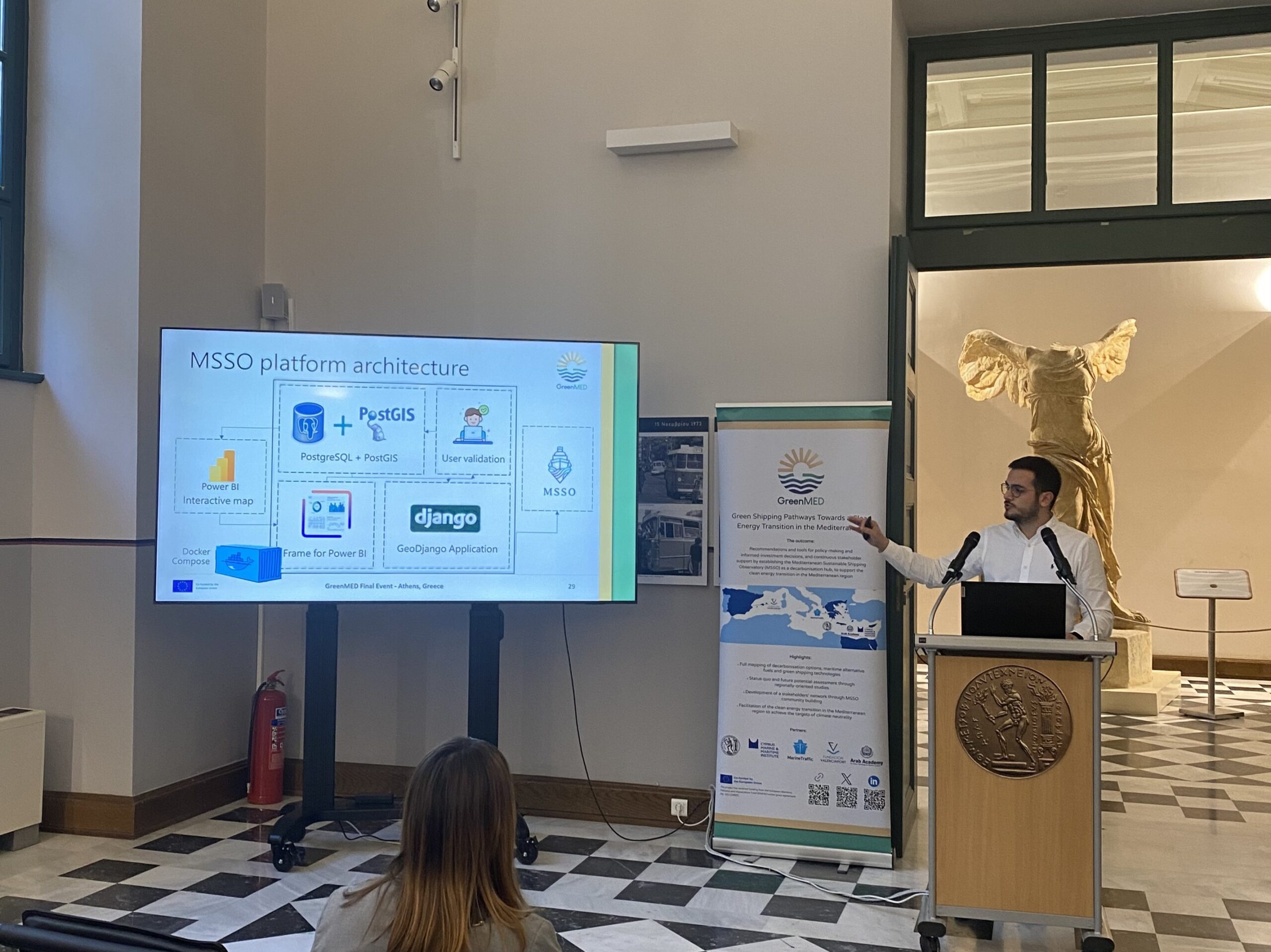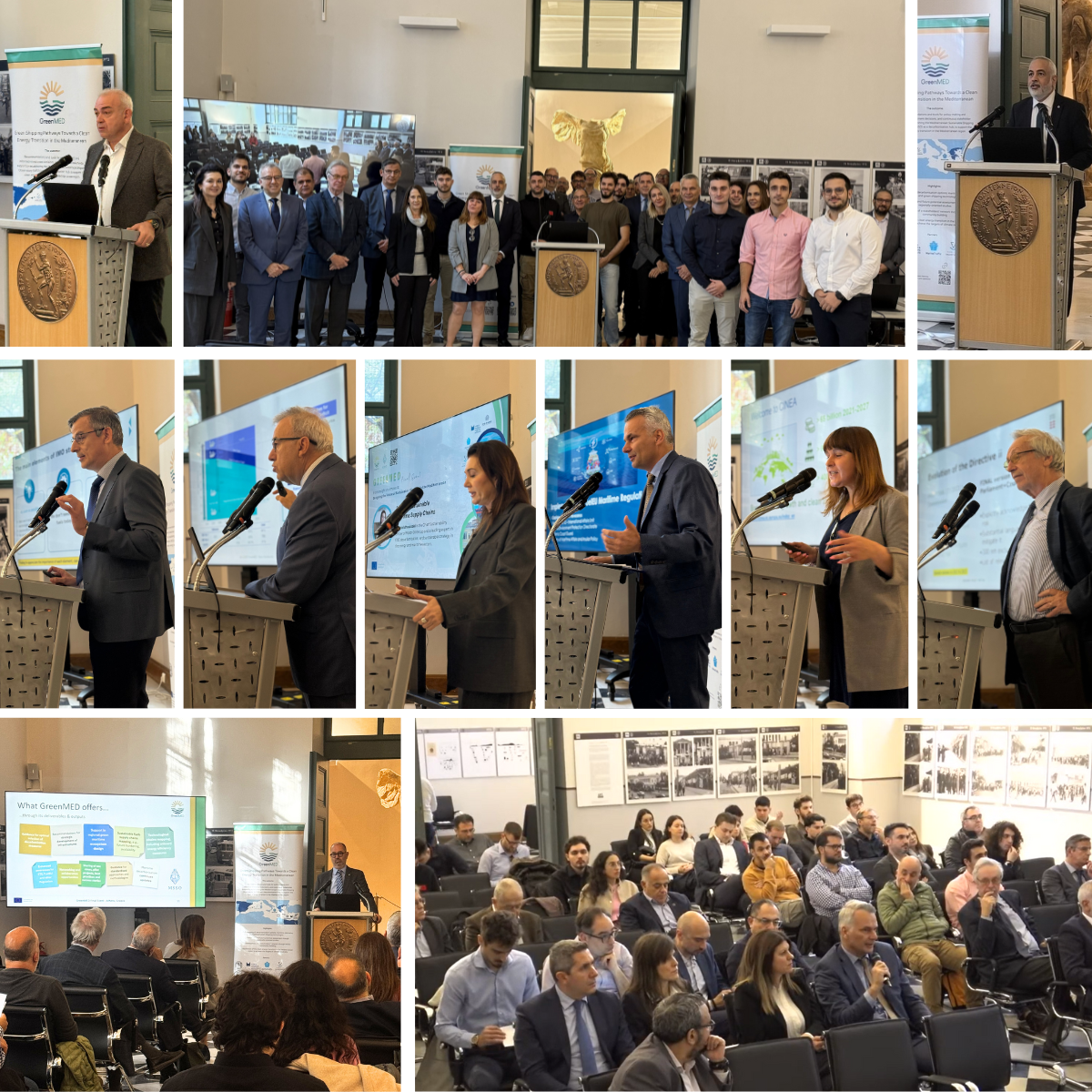 The GreenMED Final Event, held in Athens on 26 November 2025, in the historic premises of National Technical University of Athens, marked the culmination of a comprehensive 2-year effort to deliver green shipping pathways for the Mediterranean. In his opening address, Prof. Nikolaos P. Ventikos introduced the project’s vision and outcomes, outlining the integrated methodological framework developed by GreenMED. He highlighted the scientific basis behind the project’s studies, fuel and energy demand analyses, supply chain and port-focused mappings, including foresights and cost–benefit modelling. Central to this introduction was the Mediterranean Sustainable Shipping Observatory (MSSO)—a decarbonisation hub for the Eastern and wider Mediterranean region—and its platform and tools, designed to support decision-making by enabling stakeholders to explore decarbonisation options and identify industry gaps, under evolving market and policy conditions.